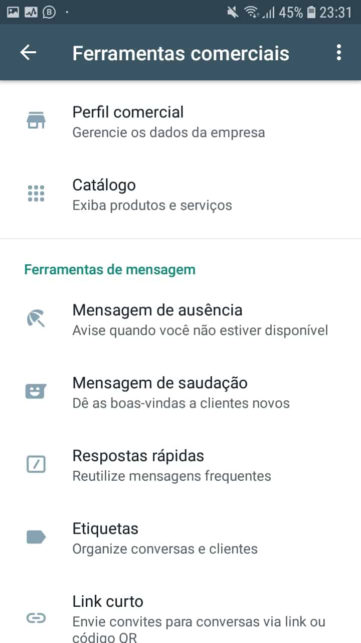 - Abra o app WhatsApp Business e clique em Configurações > Ferramentas comerciais.