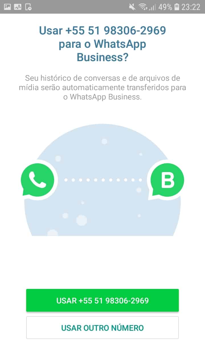 ⇒ Se você já tem uma conta no WhatsApp [ e deseja usar a sua conta pessoal], você pode transferir os dados da sua conta para sua nova conta do WhatsApp Business.