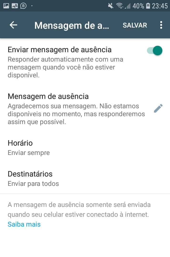 Observação: Suas mensagens de ausência serão enviadas apenas quando você tiver uma conexão de Internet.